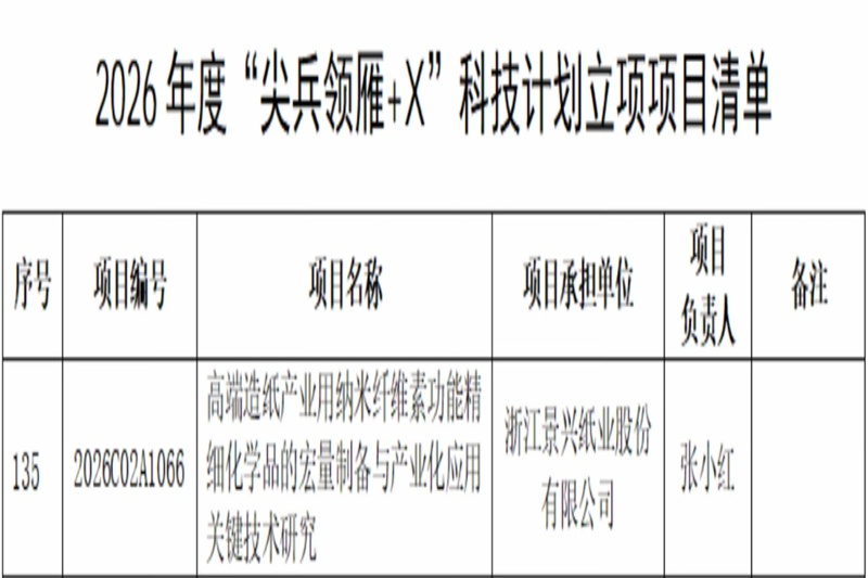 2025年12月30日,经过严格筛选,浙江省科学技术厅下达了2026年度“尖兵领雁+X”科技计划项目,银河集团(galaxy)承担的“高端造纸产业用纳米纤维素功能精细化学品的宏量制备与产业化应用关键技术研究”项目(编号:2026C02A1066)获批“领雁”项目。